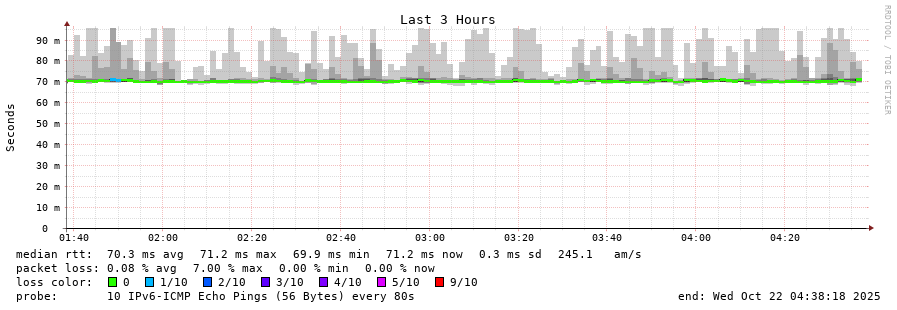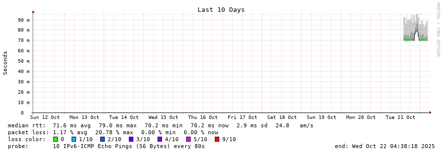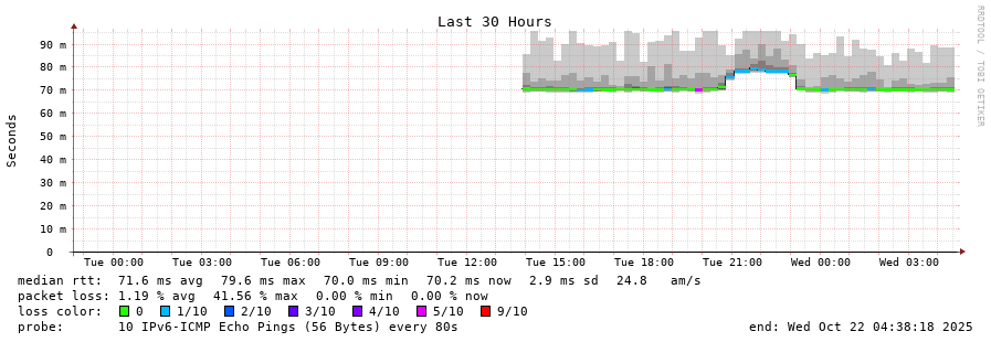 traceroute to 2001:470:1f13:814:1ad6:c7ff:fe2a:502 (2001:470:1f13:814:1ad6:c7ff:fe2a:502), 30 hops max, 80 byte packets - Generated at 2025-10-22 04:30:01