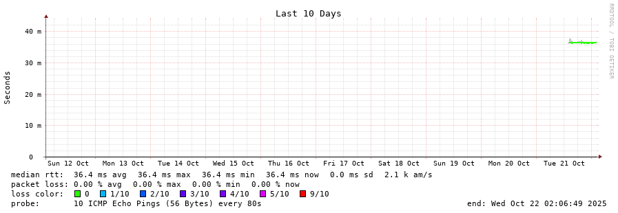 traceroute to 209.206.20.108 (209.206.20.108), 30 hops max, 60 byte packets - Generated at 2025-10-21 20:30:01 3 > 4 > 5 > 6 > 209.206.20.108 (209.206.20.108) [AS13150] 36.359ms 36.301ms 36.426ms